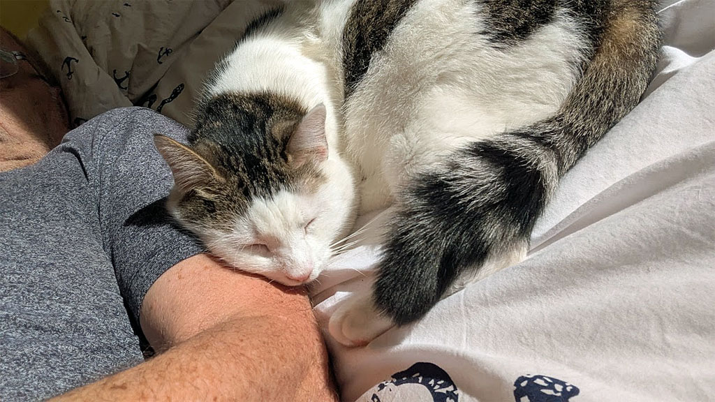 Heute Morgen nach der Massage Kuschelstunde angesagt. Der kabellosen Tastatur sei dank kann ich immer reichlich Platz schaffen damit es meine Herzkatze bequem hat. Heute kuschelte Glinda sich mit dem Köpfchen an meinen Bauch, ist ja reichlich davon vorhanden. Eine Pfote legte sie auf die andere Seite, es sah aus, als wollte sie mich umarmen.