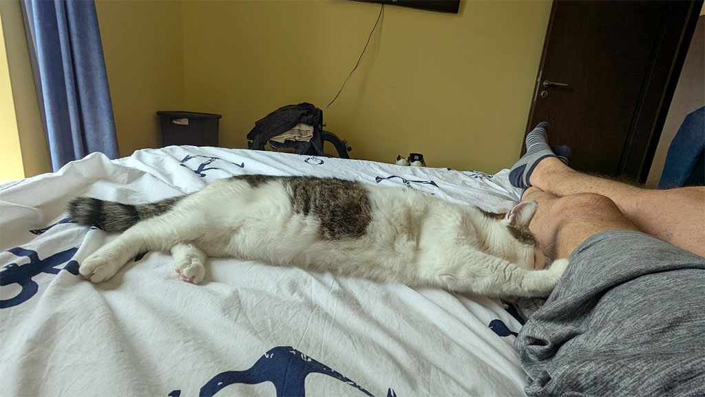 Zur Entlastung des Rückens lege ich mich zwischendurch mal auf das Bett und lese den E-Reader leer – was niemals passieren wird. Gestern bekam ich Gesellschaft, Elphie legte sich zu mir. Zuerst lag sie an meinen Beinen, später kam sie weiter rauf und schmiegte sich an meinen Arm. Es ist so praktisch, dass ich den Kindle einhändig halten und bedienen kann, dann störe ich die Katzen nicht, wenn die mir im Bett mal gesellschaft leisten.