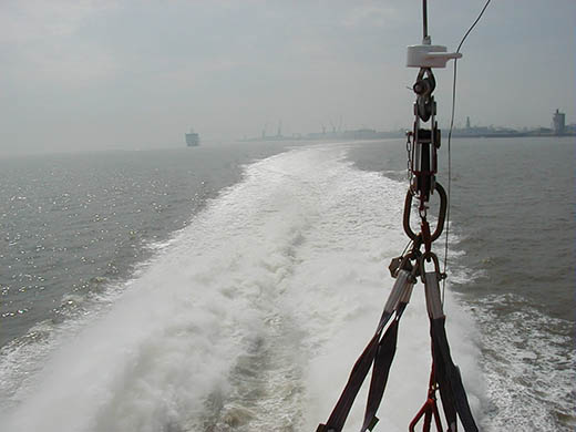 Ab jetzt nahm die „Halunder Jet“ volle Fahrt auf. Im gesamten Fahrgastraum verteilte Bildschirme zeigten abwechselnd die Position des Schiffes auf einer elektronischen Seekarte und mit einer Kamera aufgenommene Livebilder nach vorn und achtern. Ausserdem wurde unter anderem die aktuelle Geschwindigkeit angezeigt. Teilweise düsten wir mit über 40 Knoten die Elbe hinab, begünstigt durch das ablaufende Wasser.