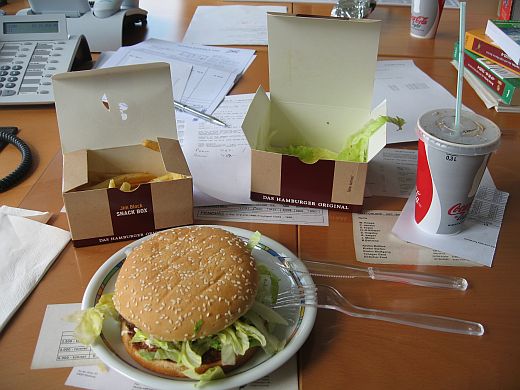 Am Schreibtisch zu essen ist zwar nicht so gemütlich wie in der Kantine, aber es ist auszuhalten.