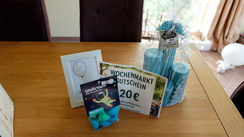 Natürlich musste ich Kuchen essen, ich entschied mich für Apfelkuchen vom Blech. Und natürlich kaufte ich 5 Lose für 10 Euro. Als ich diese öffnete, war nur eine Niete dabei, 4 Lose waren nummeriert. Mit unserem Freund Holger, mit dem ich mich verabredet hatte, spazierte ich auf dem Gelände des Hotels und durch die nähere Umgebung bevor wir unsere Tombolagewinne abholten. Zum Glück, denn das Kerzenset war ziemlich unhandlich und schwer. Der beste Gewinn für mich ist der Gutschein für den Wochenmarkt, das ist perfekt. Wegen der Katzen können wir mit den Kerzen nichts anfangen. Das Set werden wir wohl verschenken.