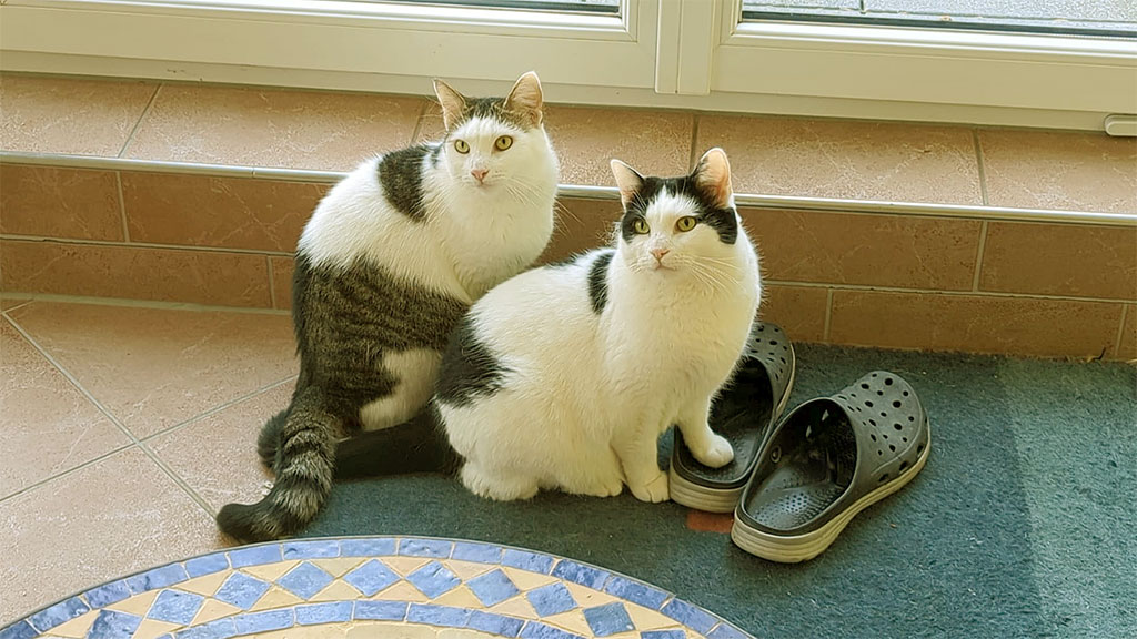Nach dem Frühstück räumten wir die Küche auf. Hinter uns sassen die beiden Katzen vor der Terrassentür und schauten uns an, d.h. sie schauten eher Bernd an, der neben mir stand. „Gesagt“ hat keine von beiden was. Aber es war ganz eindeutig, was sie wollten. Ganz still sassen sie da und warteten darauf, dass die Tür geöffnet wird.